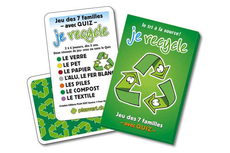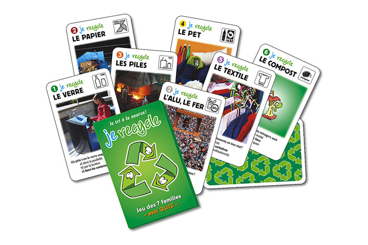 Voici un jeu des 7 familles sur le thème du recyclage avec un quiz. Chaque joueur demande au joueur de son choix une carte pour compléter une de ses familles. Si ce joueur possède cette carte, il lui pose la devinette de la carte (exemple : "Combien de fois peut-on recycler le métal?" et un choix de réponses multiples). C'est donc un peu plus complet et divertissant qu'un 7 familles classique, et c'est surtout un bon moyen de sensibiliser les enfants aux enjeux du recyclage !