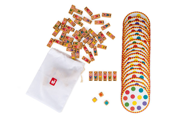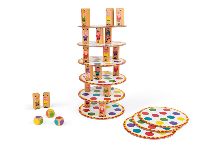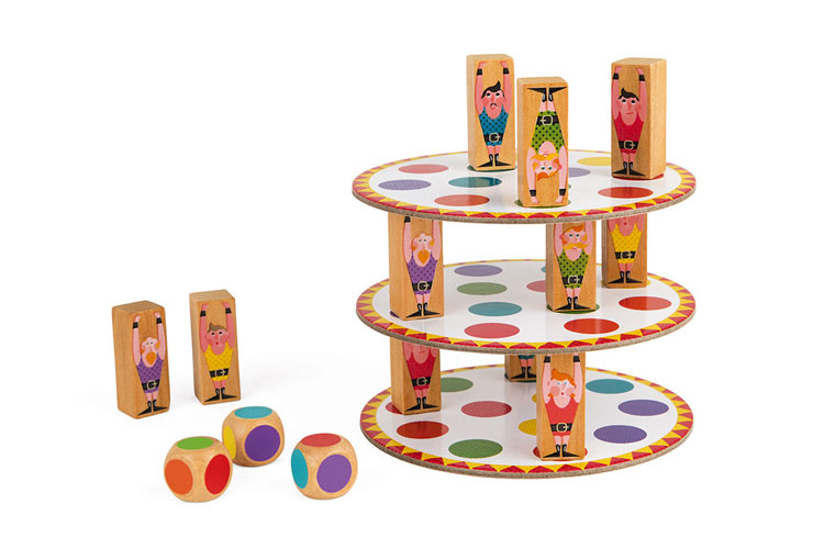 Acrobat' est un jeu d'adresse qui demande de la concentration et de la précision. Chacun son tour, chaque joueur lance les dés puis doit placer ses acrobates de façon stratégique pour créer la tour la plus haute possible. On peut jouer en mode coopératif ou compétitif. Attention à ne pas faire tomber la tour ! Ce jeu permet aussi de stimuler la reconnaissance des couleurs et est un bon moyen de travailler la motricité fine, comme tous les jeux d'adresse et d'équilibre de Janod d'ailleurs ;-)