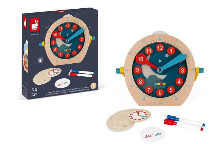 Un jeu vraiment très chouette qui a été sollicité à l'unanimité par nos familles testeuses : c'est une vraie horloge mais qui inclus également un jeu pour reproduire les heures. C'est un jeu très complet pour apprendre à lire l'heure qui est sollicité par les enfants vers 5/6 ans qui se sentent frustrés de ne pas savoir lire l'heure. 13 cartes modèles avec d’un côté le format numérique et de l’autre côté, le format analogique pour se familiariser aux 2 systèmes de lecture, 1 carte modèle neutre effaçable pour écrire d’autres combinaisons à l’aide des 2 feutres fournis (rouge pour les heures et bleu pour les minutes), 6 fiches à glisser dans la fente de l’horloge : le jour/la nuit et 4 fiches pour mieux visualiser les notions de 15-30-45 et 60 minutes.