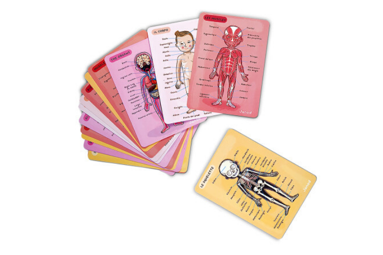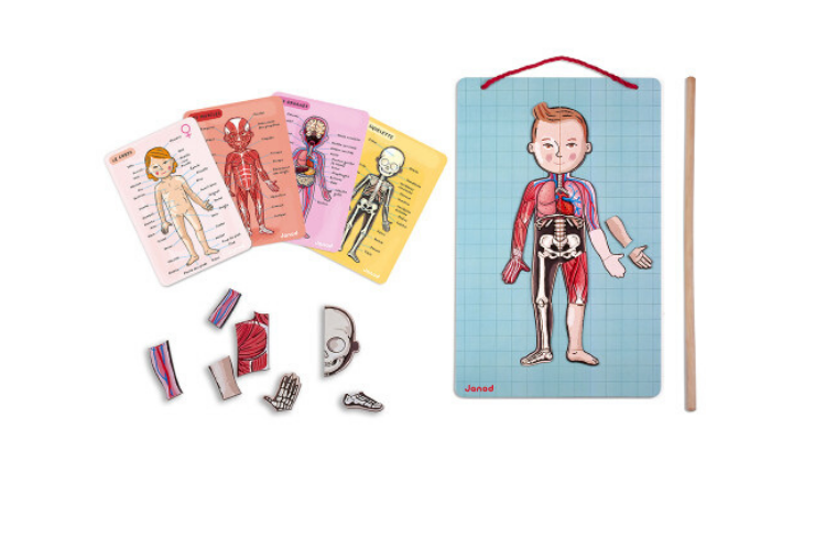 Un très beau jeu intelligent qui remplit de nombreuses fonctions : d'abord, la découverte du corps humain qui fascine beaucoup les enfants à cet âge là. Le sytème de magnet permet aux enfants de replacer les différents organes sur le corps pour mieux comprendre le fonctionnement du corps humain. Le jeu contient 4 cartes avec descriptif détaillé sur le squelette, les organes, les muscles et le corps. Autre point intéressant, les cartes sont en 12 langues différentes donc on peut également l'utiliser pour s'approprier le langage du corps humain dans de nombreuses autres langues ! Une baguette en bois permet de faire comme les professeurs et de montrer des parties spécifiques en donnant des explications.