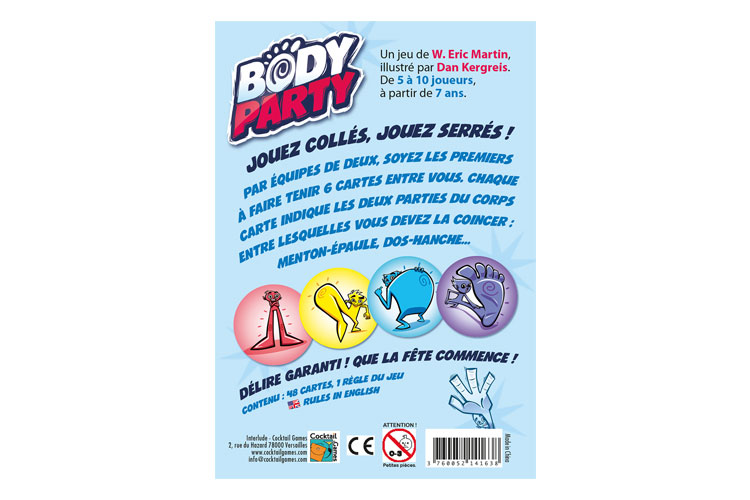 Ce jeu d'ambiance promet de belles tranches de fou-rires ! Par équipe de deux, il faut être le premier duo à maintenir 6 cartes coincées entre différentes parties du corps... le vôtre ET celui de votre partenaire ! Par exemple : menton/épaule. Chaque carte indique les deux parties du corps entre lesquelles elle doit être positionnée. Ce jeu absolument hilarant demande une bonne coordination et évidemment la coopération des deux partenaires pour coincer et maintenir chacune des cartes. On gagne en duo ! Délire garanti, en famille ou entre amis.