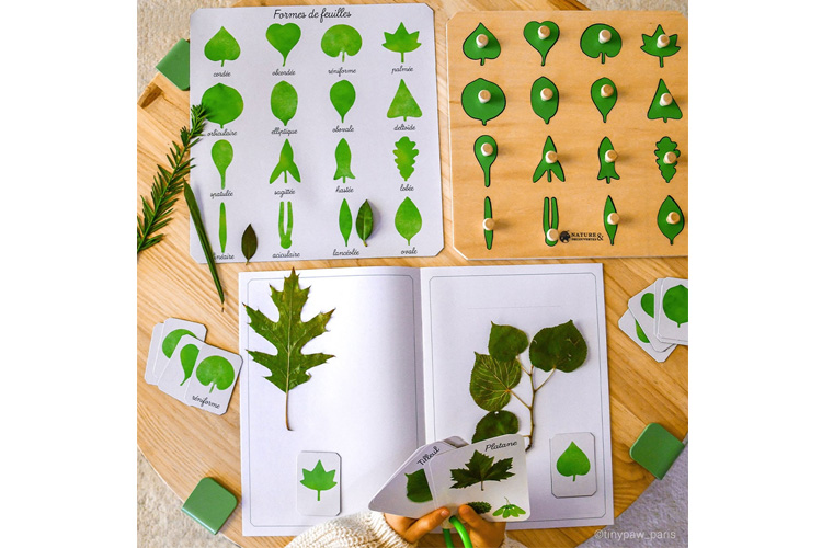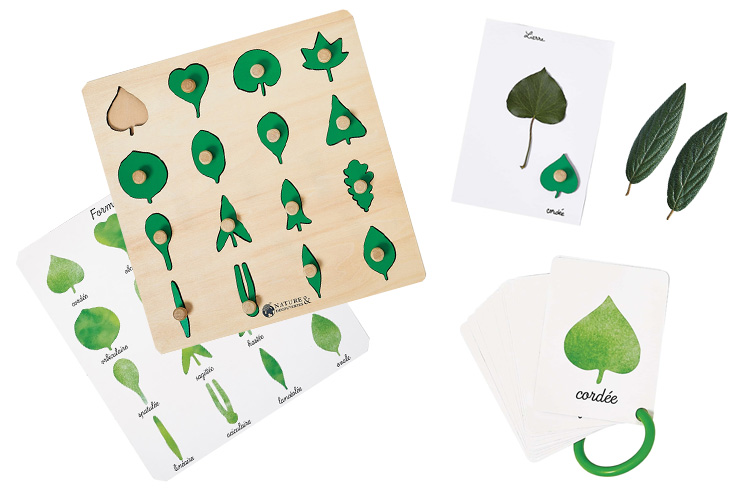 Voici un jeu éducatif conçu dans le respect de la pédagogie Montessori. Il contient des formes de feuilles en bois à encastrer, nommer, détourer, etc. ainsi qu'un herbier de 20 pages, un jeu de memory et divers outils pour identifier, classifier et mémoriser les feuilles des arbres dans la nature. L'enfant découvre les feuilles et développe ainsi sa compréhension de la nature, des arbres en particulier.