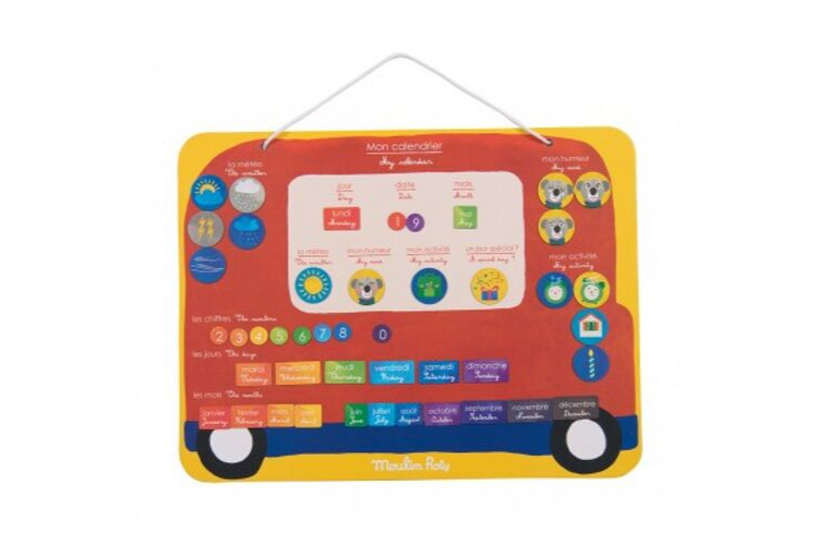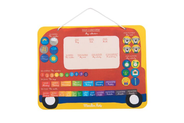 Rien de mieux pour faire des plans que de comprendre la notion de temps et de chronologie. Le calendrier magnétique Moulin Roty est l'outil parfait pour aider l'enfant à se repérer dans le temps et planifier ses activités. En plus, tous les mots figurants sur le tableau sont écrits en français et en anglais pour une première initiation à une seconde langue ! Un bel outil que les enfants aiment s'approprier.