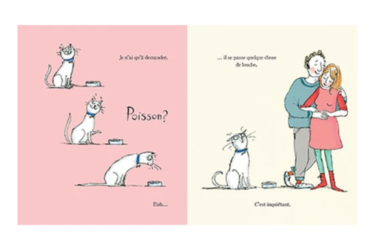 Un chat choyé par ses maîtres se rend compte que les choses sont de plus en plus étranges à la maison : ses maîtres semblent moins attentifs à lui. Quand il demande du poisson, son repas préféré, il en obtient normalement assez vite... mais cette fois-ci, ils lui présentent des vêtements et des jouets de bébé... Que se passe-t-il ? Un petit livre touchant qui aborde la thématique de la jalousie au sein des fratries !