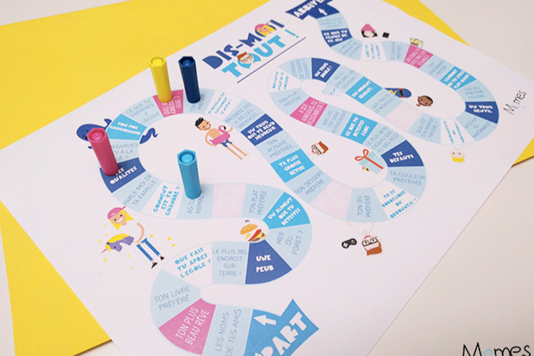 Ce jeu à imprimer sur Momes.net encourage les enfants à parler d’eux ou à se présenter. Il suffit d’imprimer le plateau de jeu et de se munir de 4 pions et d’un dé. Parfait entre amis ou en famille pour faire parler les enfants et les pousser à réfléchir à certaines questions qu’ils ne s’étaient peut-être jamais posées. Il n’y a pas de gagnant mais pour pimenter le jeu, il est utile de demander aux enfants ce qu’ils ont retenu de plus intéressant sur les autres joueurs quand ils atteignent la case « Arrivée ».