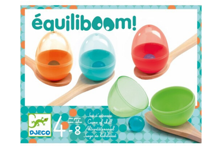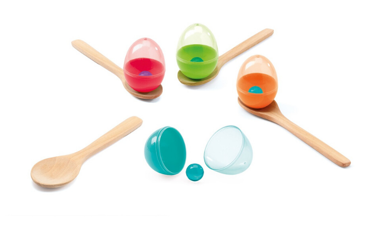 Le jeu Equiliboom est parfait pour se faciliter la vie et éviter de devoir casser des vrais oeufs. Le principe du jeu est simple mais peut se décliner de mille façons : les enfants doivent chacun se munir d'une cuillère et poser l'oeuf avec la bille à l'intérieur et c'est parti pour une course effenée au cours de laquelle l'oeuf ne doit pas tomber. Si l'œuf chute, il faut rattraper la bille, la remettre dans l'œuf et reprendre la course de plus belle. De quoi faire travailler le sens de l'équilibre...