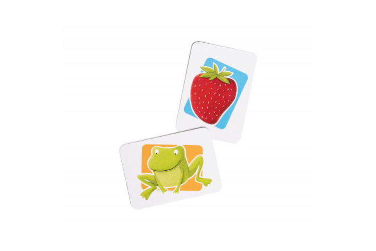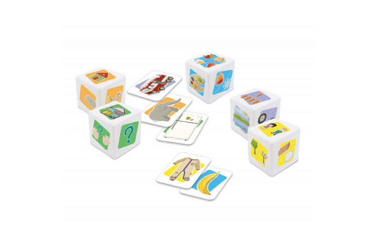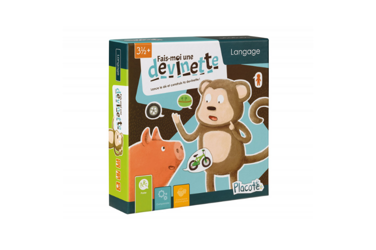 Ce petit jeu, destiné aux enfants de 3 à 7 ans, est un bon support pour leur apprendre à créer des devinettes. Il contient 60 cartes imagées (ex : une fraise, une grenouille) ainsi que 5 dés également imagés. Le but du jeu est de faire deviner aux autres autres ce qu'il se trouve sur notre carte en s'appuyant sur les dés et en fournissant des indices. Pour s'aider, on peut également utiliser un petit aide-mémoire visuel. Un jeu idéal pour apprendre à construire des phrases complètes et enrichir son vocabulaire.