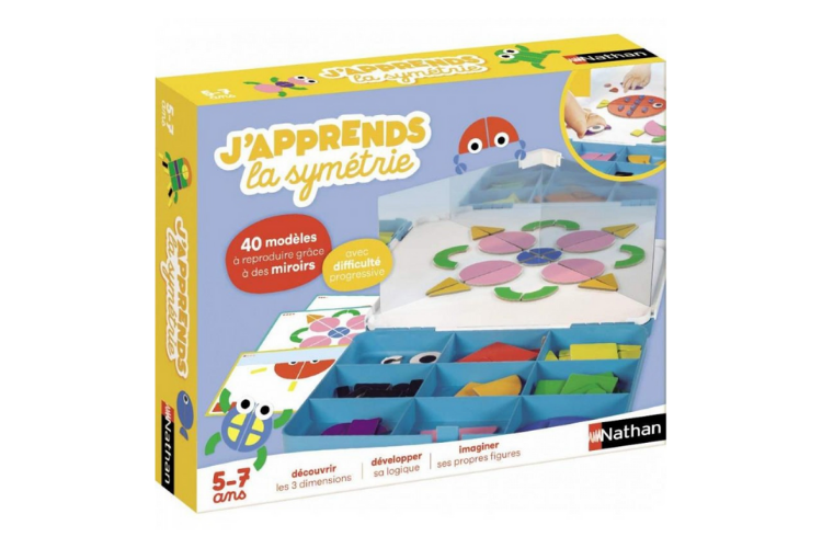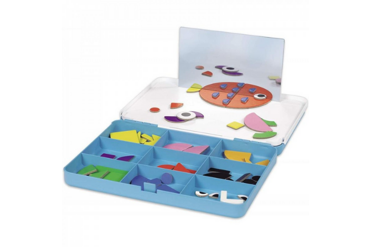 Recommandé dès 5 ans. Cette mallette initie les enfants au principe de la symétrie. À l'aide figures géométrique et d'un ou deux miroirs, les enfants doivent reproduire ou créer des figures similaires aux modèles sur les planches. Les niveaux de difficultés sont évolutifs. On peut jouer au jeu de 3 façons : avec un seul miroir, avec les deux miroirs combinés ou simplement en mode jeu libre. La mallette est également équipée d'une poignée afin de pouvoir être transportée partout.