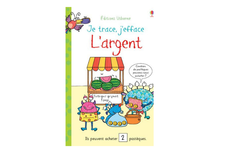 Un chouette livre au nom un peu étrange de chez Usborne qui est fourni avec un feutre effaçable. En compagnie de gentils petits monstres, les enfants apprendront à compter l'argent, à payer et à rendre la monnaie, en ajoutant et en enlevant les bonnes pièces. Grâce aux pages effaçables du cahier, ils pourront s'entraîner à volonté. Une façon interactive et ludique de familiariser les jeunes enfants avec la notion de l'argent.