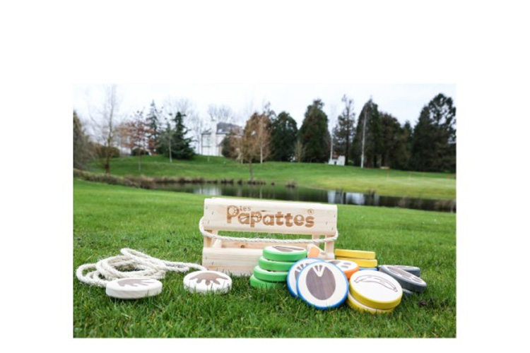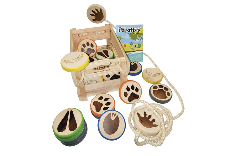 Voici un jeu de palets en bois qui invite à jouer en extérieur. Chaque joueur choisit un animal et doit l'emmener à la rivière (représentée par un fil tendu à 7 mètres de la zone à lancer). Chacun leur tour, les joueurs lancent une papatte (palet) le plus proche possible de la rivière en prenant garde à ne pas dépasser la rivière car les crocodiles rodent juste derrière ! Le parcours est semé d'embûches : croche-papattes, glissades sur peaux de bananes et papattes cassées ! Qui marquera les 25 points en premier pour gagner la partie ?