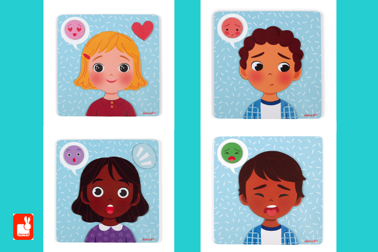 Un très joli jeu pour se familiariser avec les émotions : les cartes illustrent différentes situations de la vie quotidienne. Il est accompagné d'un guide des émotions rédigé par des psychomotriciens. Au dos de chaque carte un visage "réponse" correspond aux magnets à utiliser pour reproduire le visage correspondant à cette émotion. Le jeu est évolutif avec 2 niveaux différents pour reproduire les émotions ou les deviner. Le petit plus : le jeu contient un miroir pour lui permettre de "tester" les émotions sur son propre visage !