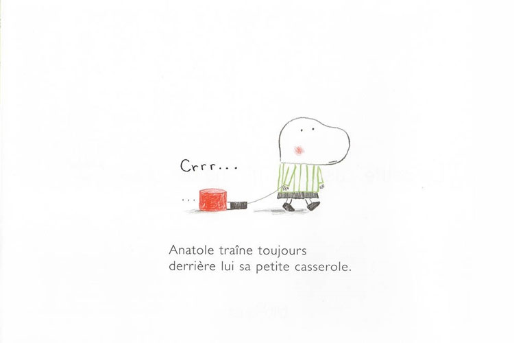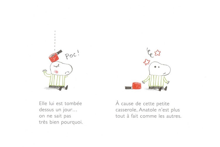 Anatole traîne derrière lui une petite casserole, et au lieu de s'intéresser à ses qualités, les gens qui le croisent regardent surtout sa casserole... Ce petit livre permet d'aborder la question du handicap et de l'acceptation de la différence. C'est un beau message de tolérance et un outil intelligent pour sensibiliser les enfants. En effet, dans un groupe : tout le monde est différent et ce n'est pas parce qu'un autre enfant n'est pas ou ne pense pas comme moi qu'il n'est pas normal ou légitime dans sa pensée et ses actions. Apprendre à collaborer c'est aussi apprendre à écouter les autres, à les intégrer dans le groupe sans les juger.