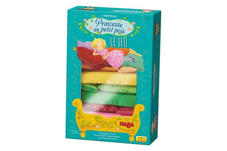 Voici un jeu d'adresse sur le thème du conte "La princesse au petit pois". Le but ? Faire le lit de la princesse, sur le petit pois ! On jette le dé et, selon le résultat, on ajoute ou on enlève une pièce (coussins, oreillers, matelas) mais attention à ne rien faire tomber ! Les différents éléments sont réalisés en tissu, ce qui rend ce jeu d'autant plus intéressant d'un point de vue sensoriel. C'est un jeu collaboratif (on gagne ou on perd ensemble) qui est bien conçu pour intéresser les plus petits.