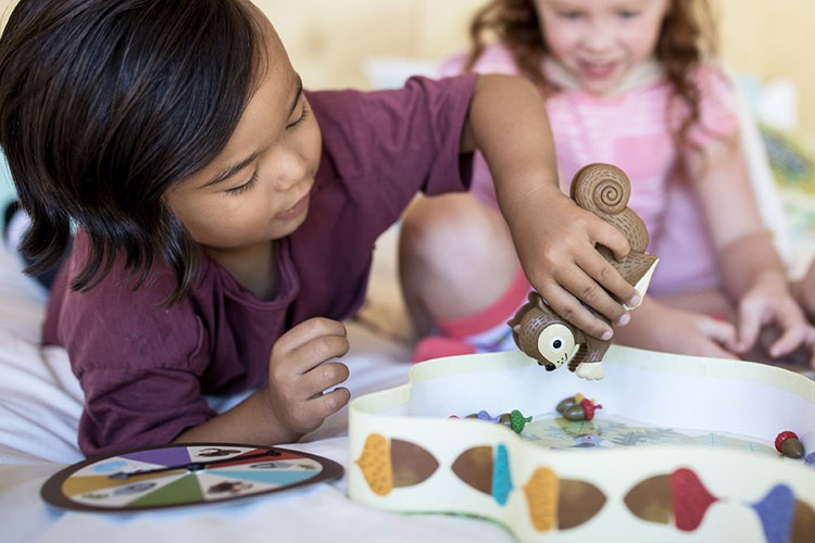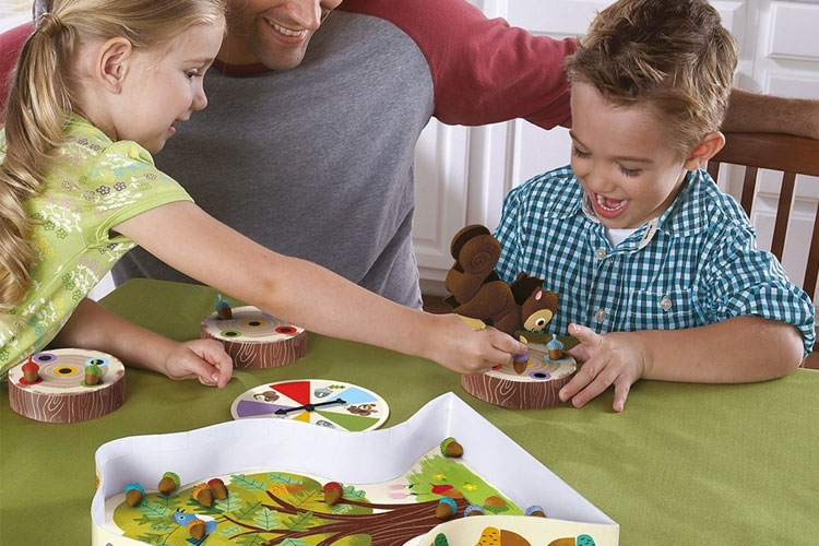 Qui sera le premier à faire sa réserve de glands pour l'hiver ? Les joueurs doivent manier une pince en forme d'écureuil pour récupérer leurs glands, mais attention, de petits coquins peuvent venir te piquer ta récolte ! Ce jeu favorise la reconnaissance des couleurs et la motricité fine. C'est aussi un excellent support pour apprendre à jouer à plusieurs en respectant des règles simples. On aime le plateau et l'originalité du jeu, très visuel. C'est juste dommage que les pièces soient en plastique...
