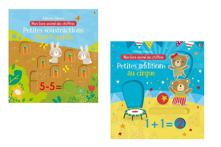 Ces deux livres réunissent tous les ingrédients pour introduire les premières notions de calcul. Grâce aux tirettes, les additions et les soustractions deviennent un jeu d’enfant. Des jolies illustrations, des textes simples et répétitifs qui aident les jeunes enfants à comprendre le sens de l’addition. Ils aimeront actionner les tirettes de ce livre pour faire de simples additions ou des soustractions avec la seconde édition. Mon livre animé des chiffres : une toute nouvelle collection destinée aux jeunes enfants. Les livres sont vendus séparément mais ils se complémentent bien.