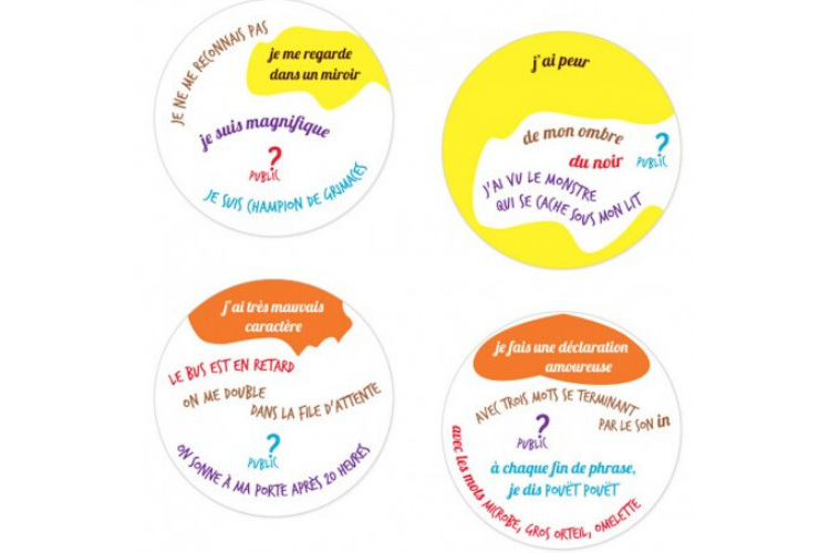 Ces petites cartes à emporter partout demande aux enfants de bien réfléchir à comment créer une histoire intéressante en partant de la situation donnée sur la carte. Sur chaque carte: une situation à jouer et 3 variantes. C’est le public qui va choisir quelle variante jouer. On peut tout à fait donner l’exemple pour décomplexer les enfants et leur montrer qu’il s’agit d’un jeu, et donc qu'ils peuvent lâcher prise. Ils vont vite découvrir que, finalement, devoir raconter une histoire autour de contraintes peut être très drôle et stimulant pour la créativité. Si on joue le jeu, on est rarement déçu du résultat. Ce jeu est même recommandé par la comédie française !