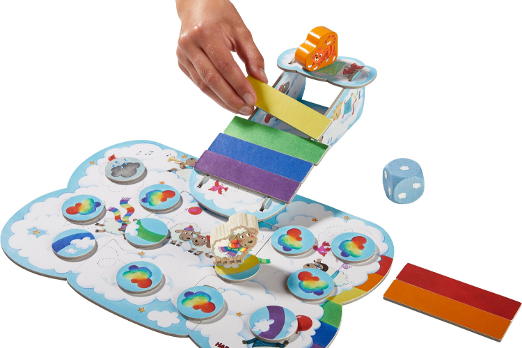 Un petit jeu très bien conçu pour captiver l'attention des plus petits : c'est avant tout un jeu coopératif dans lequel on doit construire un arc-en-ciel et faire avancer un petit mouton. On se familiarise d'une part, avec les chiffres grâce au dé qui indique le nombre de nuages que le mouton va parcourir et d'autre part, avec les couleurs en construisant l'arc-en-ciel. Enfin on s'amuse à faire glisser les animaux sur l'arc-en-ciel un fois terminé ! Un jeu modulable et d'excellente qualité pour les jeunes joueurs.