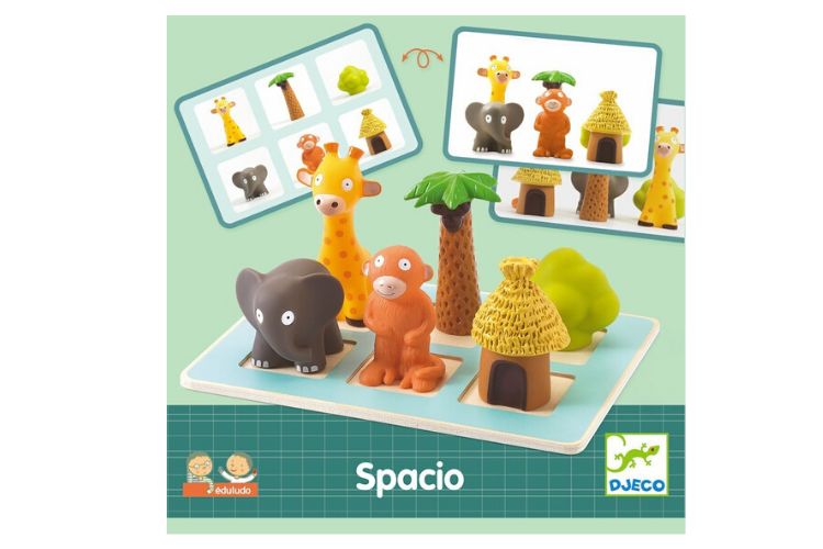 Un jeu de la collection Eduludo (jeux éducatifs de Djeco) qui aide à apprendre à se repérer dans l'espace. Le repérage dans l'espace peut-être extrêmement abstrait pour les enfants. Avec ce beau jeu sur le thème des animaux de la Savane, les enfants doivent reproduire en 3D, un illustration 2D. Pas si évident mais cela stimula la réflexion tout en apprenant la notion d'espace et enrichissant le vocabulaire : devant, à côté, à droite, derrière...