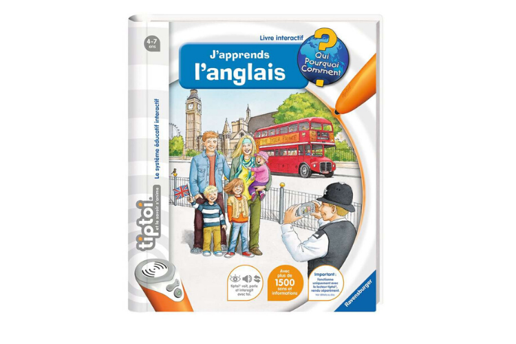 Le système Tip Toi de Ravensburger, si vous ne le connaissez pas, fonctionne avec un sorte de stylo interactif qui permet ensuite d'être utilisé avec de nombreux supports différents pour apprendre sur tous les sujets. Grâce au livre "J'apprends l'anglais", les enfants se familiarisent avec le vocabulaire de la vie courante en anglais. Avec le lecteur, les enfants pourront entendre les bonnes prononciations. Le livre peut se découvrir de différentes manières et inclus des jeux. Attention, le lecteur Tiptoi est vendu séparément mais peut être utilisé avec de nombreux autres livres et jeux.