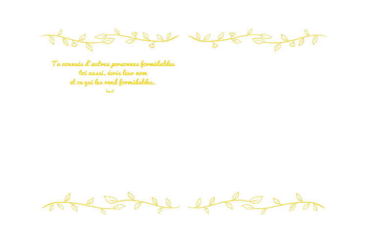 Voici un livre qui fait du bien et qui rappelle aux enfants qu'ils sont tous formidables à leur manière. On retrouve à l'intérieur 9 messages positifs qui renforceront leur confiance en soi. Il y a également plusieurs petites scènes illustrées qui rendent le livre interactif. Les enfants ont aussi l'occasion de s'exprimer dans les espaces libres à disposition. Par exemple, ils peuvent mentionner toutes les personnes formidables qu'ils connaissent ! Bref, un petit livre précieux plein de bienveillance qui redonne le sourire.