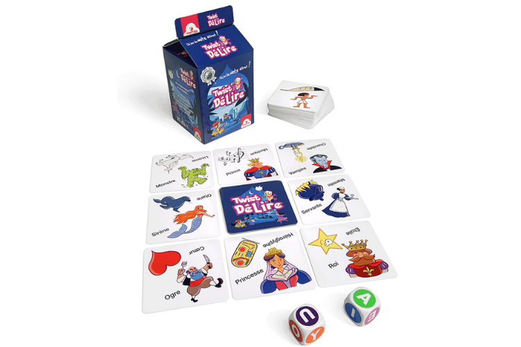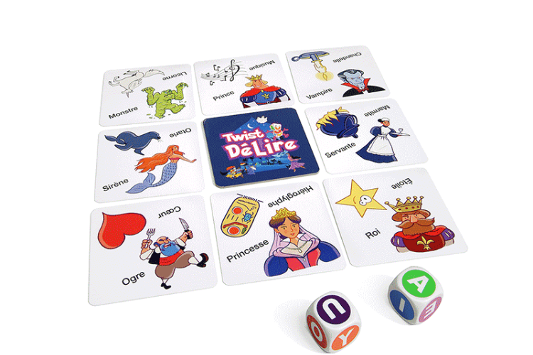 Un jeu d'observation qui développe les réflexes. le vocabulaire et l'aisance de la lecture. Les joueurs reçoivent 5 cartes pictos représentant des fruits, des objets, des animaux, des métiers, des aliments, etc. Le premier joueur lance les 2 dés voyelles et tous les joueurs sont invités à chercher parmi les cartes sur la table un mot qui contient ces deux voyelles. Le premier qui tape sur une carte correspondant a gagné. C'est un jeu évolutif avec des parties rapides et efficaces.
